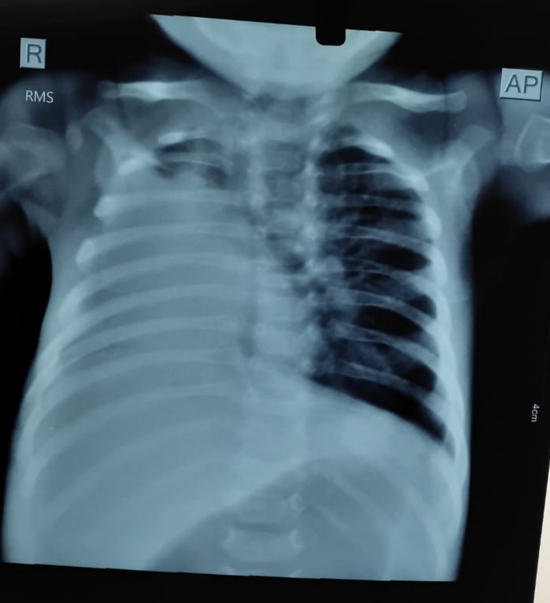 A 2-month-old infant was admitted to the hospital with severe pneumonia. The child had been under inpatient care for over two weeks with persistent symptoms and no significant clinical improvement. Chest X-rays showed progressive worsening of the right lung, and the infant remained dependent on oxygen support.